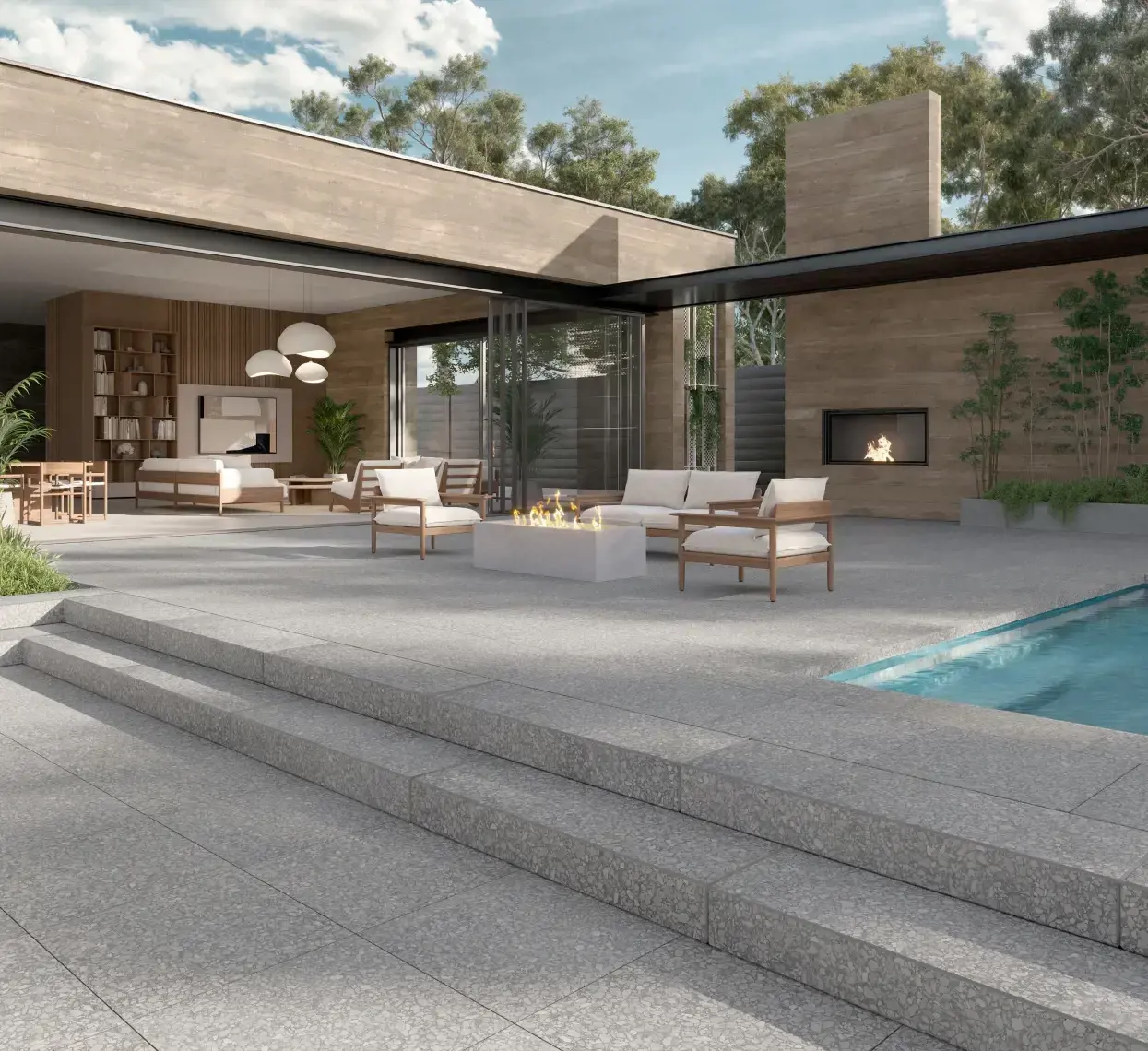 Bold in scale, sleek in design. This oversized slab comes in seven refined HD2 colors, including Caffè Crema and Silver Granite—a stylish, cost-efficient choice for patios and pool decks.